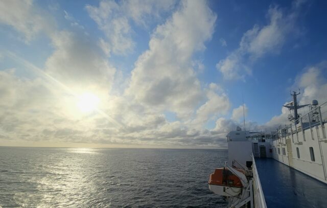 Zum Glück bewahrheitete sich die Wettervoraussage des Kapitäns nicht, wegen der wir die Töffs fest…